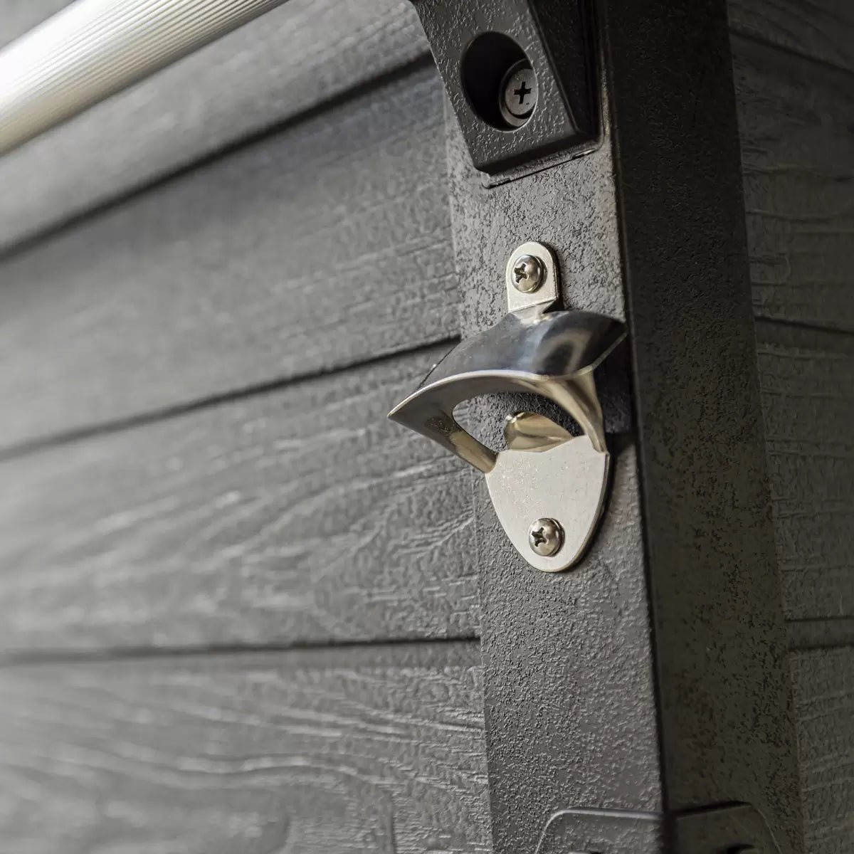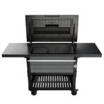 The elegant wood-look EVOTECH panels give the classy look of wood while the frame has a unique cast-iron look, yet it is completely weather resistant and never needs any maintenance. Its design emphasizes versatility, with two strong fold-up side shelves, a convenient fold-down narrow shelf, a movable cooler bin divider that also functions as a tray, and ample lower-shelf storage. Add to that clever practical touches like a drainage system, bottle opener, and wheel locks you can unlatch without scuffing your shoes.