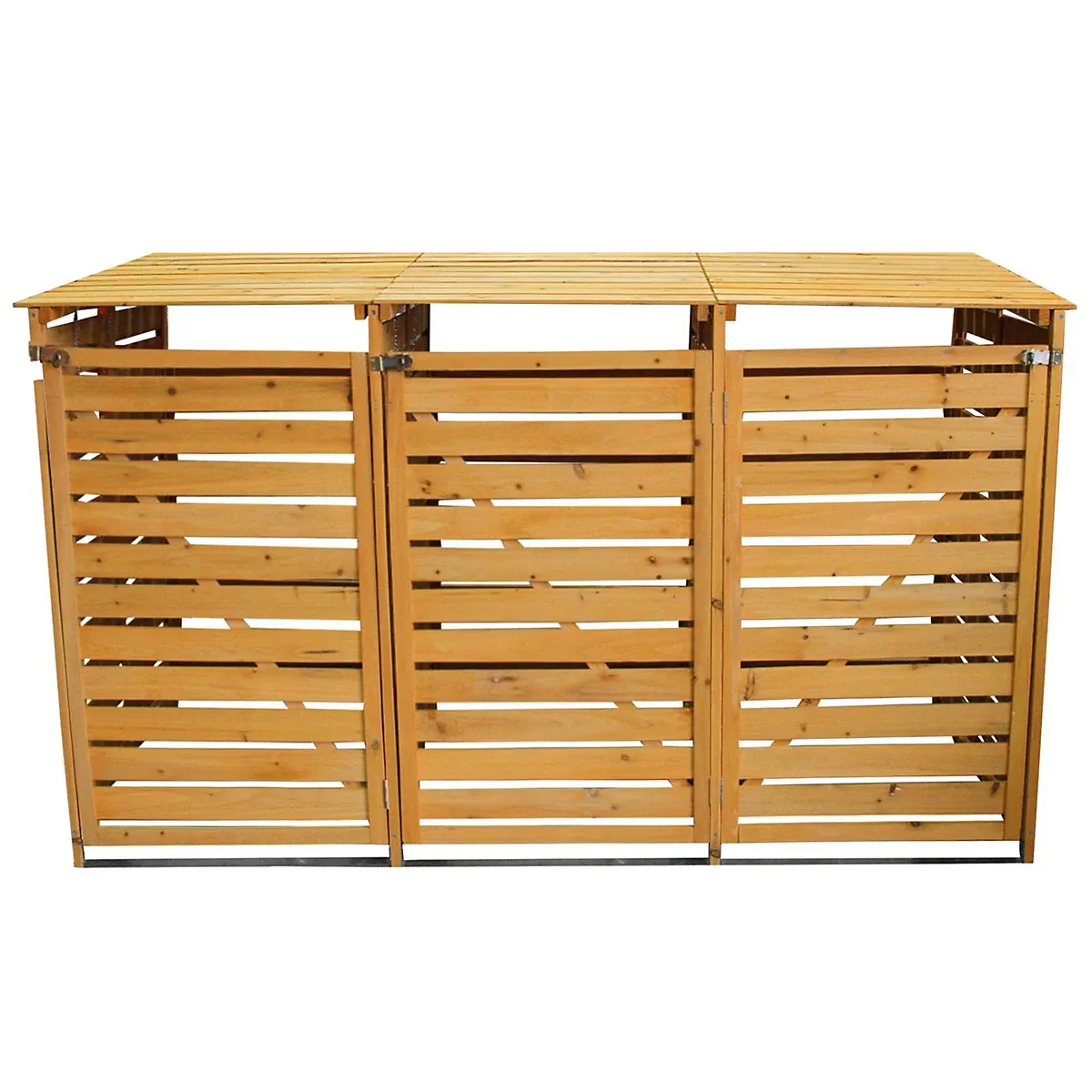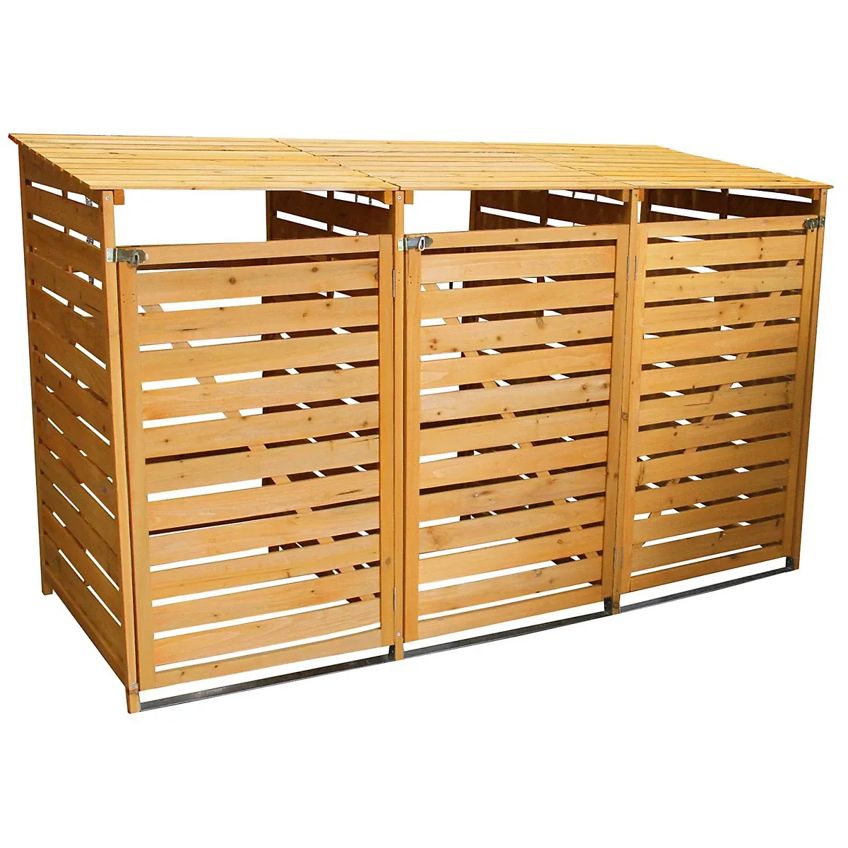 Conceal 3 x 240L Standard-sized wheelie bins in style Made from strong and long-lasting Timber Latched doors and easy access lids Small padlocks could be affixed to the latch for extra safe keeping FREE fixing kit to attach to wall/fence for added security Dimensions: 120cm (H) x 198cm (W) x 81cm (D) Specifications: Material: Timber Assembly: Flat-packed with quick and easy assembly Dimensions: 120cm (H) x 198cm (W) x 81cm (D)