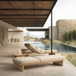 The table’s top, with its harmonious slats of teak, is complemented by the hand laced rope that forms the body of the piece, offering visual intrigue. These handwoven panels allow for a playful dance of light and shadow, adding depth to the design. The light teak finish lends a warm, inviting tone to the table, suggesting a sense of serene luxury.
